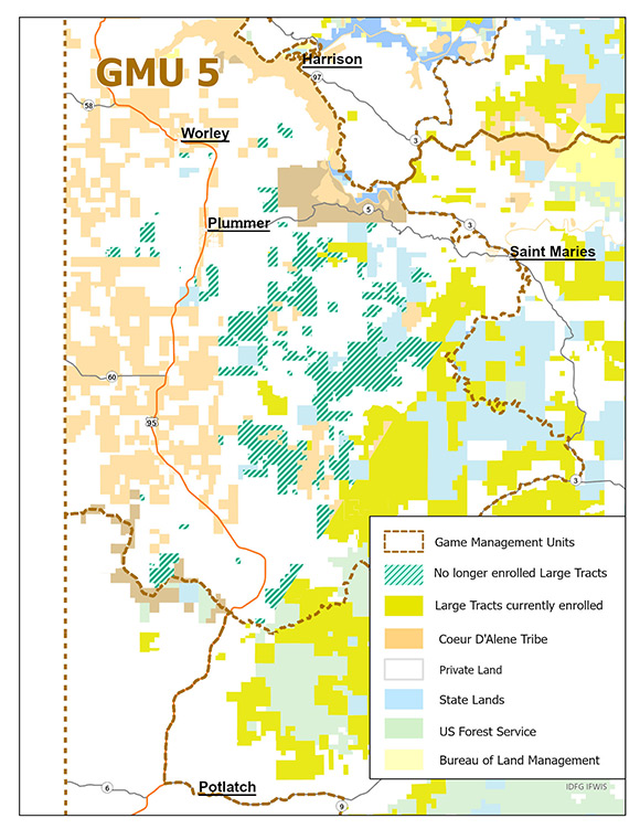In late September, land sales in Idaho’s Game Management Unit 5 – the Panhandle region – removed nearly 30,000 acres of private land, previously enrolled in the state’s Large Tracts Program and open to hunting, from the program. The land was owned by Stimson Lumber. It was sold to the Coeur d’Alene Tribe. The land is located on the Coeur d’Alene Reservation and has always been an important part of the tribe’s homeland. Entering any private land while access is closed or restricted is trespassing. For more information about hunting on lands owned by the Coeur d’Alene Tribe, hunters are encouraged to contact the tribe directly. These sales are a reminder that all Large Tracts parcels are private lands and can change ownership at any time. Outdoor people should never assume last season’s access is still valid. Always confirm land status before your trip by checking the Idaho Hunt Planner. All Large Tracts lands are privately owned and only accessible to the public due to partnerships between Idaho Fish and Game (IFG) and private landowners. Private landowners set rules for their lands, not IFG.