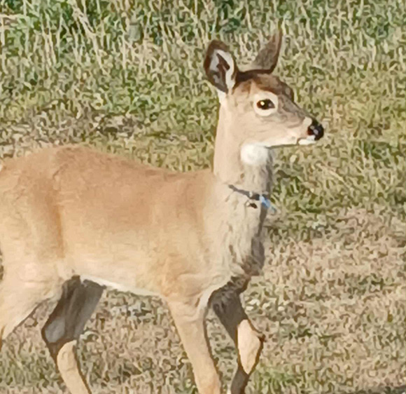 Jane Doe was a young-of the-year whitetail fawn who wore a blue baling twine necklace when I first met her. She came to hold a special spot in the hearts of the neighborhood. Photo: Nancy Whitin